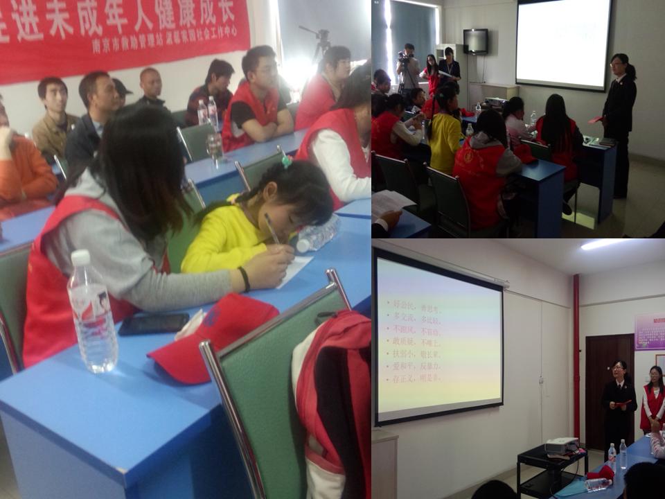 此次活动主要以知识讲座、案例分析、视频展示和趣味问答等形式,对未成年人保护中心收留儿童及栖霞区和苑社区困境儿童进行生动形象的法制教育与宣传。内容涉及健康上网、防骗防盗、自我保护等方面。