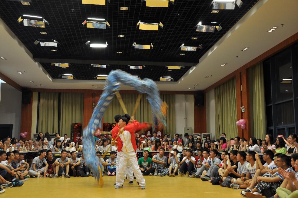 联欢会上,董军副书记与吴波辅导员为同学们献上了“龙腾华夏”舞龙表演,与同学们一同联欢。2014级的同学们精心准备了《因为爱情》、《知心爱人》、《春江花月夜》、《父亲》、《吉他独奏》、《传奇》、《小苹果》等节目,联欢会温馨的气氛令人陶醉。经济学院学生会在当天下午还为家庭经济困难的2014级学生发放了中秋月饼。