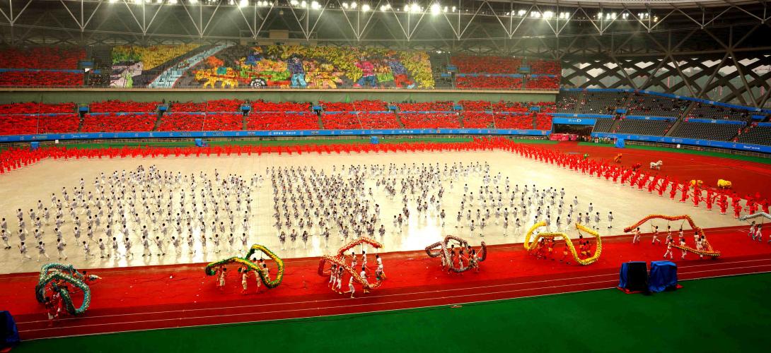 奥林匹克体育中心体育场座无虚席,一场以《汉风飞扬》为主题的开幕式拉开了省十八届运动会的帷幕。该表演以“汉文化”作为创作主线,以“中国梦”作为着力表达的时代内涵,将“更快、更高、更强”的体育精神与“三创三先”的新时期江苏精神相融合,我校大学生龙狮团参加了开幕式第三章节《风壮中华》的部分演出,龙狮所拥有的雄健、阳刚、豪迈之气和壮阔之情交相辉映、交织融合,给人以强烈的视觉冲击、情绪感染和心灵震撼。