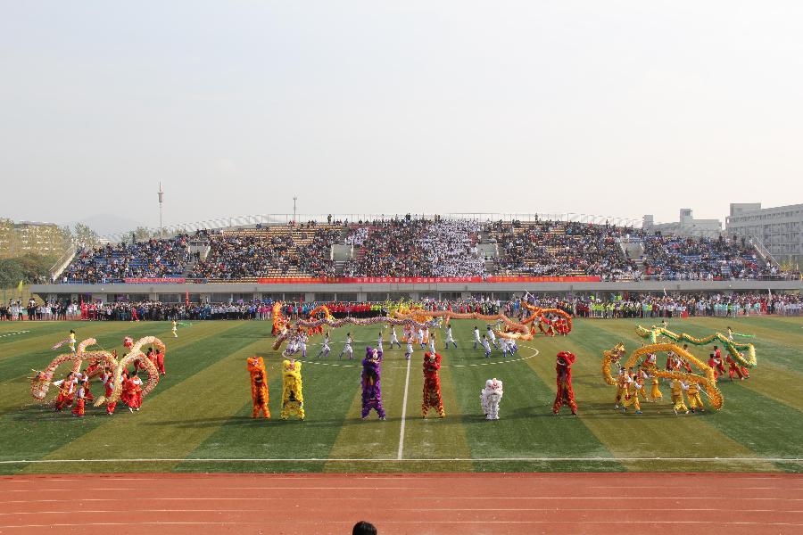 入场仪式上,经济学院党委副书记董军带领经济学院代表队参加运动会开幕式入场,我院方阵步伐整齐矫健、口号铿锵有力,舞龙舞狮气势如虹,充分展现了经院人的精、气、神!开幕式表演环节,大学生龙狮团带来了舞龙舞狮表演——九龙献瑞,但见傲龙掣风,上下穿杨;升龙腾云,翻身振翼;九龙齐舞,变幻莫测。他们用造型“中国65”,向祖国65周年华诞致敬;用造型莲花,祝愿学校运动会圆满成功,赢得了现场师生的阵阵掌声。