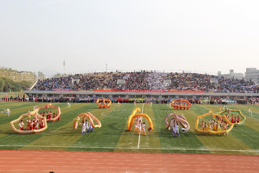 入场仪式上,经济学院党委副书记董军带领经济学院代表队参加运动会开幕式入场,我院方阵步伐整齐矫健、口号铿锵有力,舞龙舞狮气势如虹,充分展现了经院人的精、气、神!开幕式表演环节,大学生龙狮团带来了舞龙舞狮表演——九龙献瑞,但见傲龙掣风,上下穿杨;升龙腾云,翻身振翼;九龙齐舞,变幻莫测。他们用造型“中国65”,向祖国65周年华诞致敬;用造型莲花,祝愿学校运动会圆满成功,赢得了现场师生的阵阵掌声。