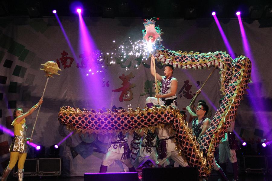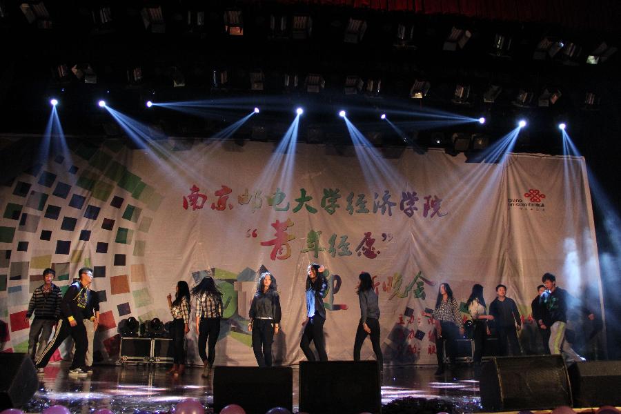 大学生舞龙表演《龙腾华夏》敲响了晚会的序章。整场晚会共分三个篇章。上篇“菁色年华”载歌载舞,新生歌曲《想把我唱给你听》奔放活泼,充满了青春的律动,国贸3班选送的小品《奉承》令人捧腹,国贸4班选送的舞蹈《Mrwaltz&Dalangcouple》动感十足,经统6班选送的三句半《大话南邮》爆笑全场,舞蹈《床前明月光》委婉动人,辅导员吴波表演的歌曲《鸿雁》勾起了大家对故乡的思念。黄一鸣副院长抽出了晚会的菁意奖——南京景点门票,引发了观众的期待。