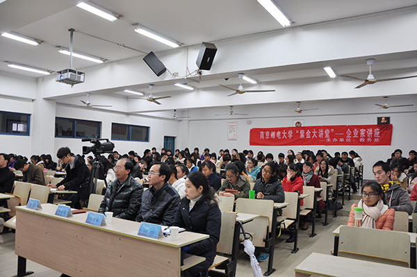 讲座伊始,储书记为在座师生介绍刘晓波高级经济师,并宣读聘请刘行长任南京邮电大学经济学院兼职教授的决定,举行了的简短的聘用仪式。随后,刘行长就金融发展与人才需求这一主题开始了他的报告。