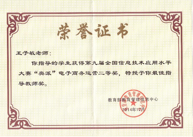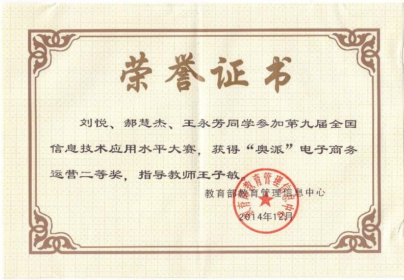 日前,第九届全国信息技术应用水平大赛在北京航空航天大学举行,经济学院王子敏老师指导的 13级经济学专业同学刘悦、郝慧杰和管理学院13级电子商务专业王永芳同学组成的代表队成功进入决赛,在“奥派电子商务运营”科目的决赛中,经过上机与现场答辩环节的激烈竞争,最终获得了第九届全国信息技术应用水平大赛二等奖,王子敏老师获最佳指导教师奖。