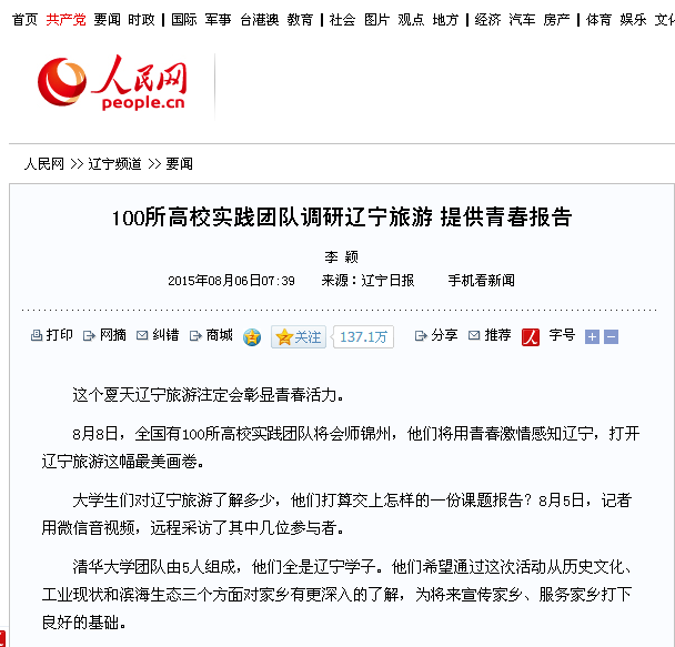 本次实践活动得到人民网、光明网、腾讯网、中国旅游网、辽宁日报、辽宁卫视等媒体关注和报道。8月6日,辽宁日报专题采访了经济学院“印象辽宁 梦想中国”暑期社会实践团队队长2014级国际经济与贸易学生叶茂坤,后经人民网转载。