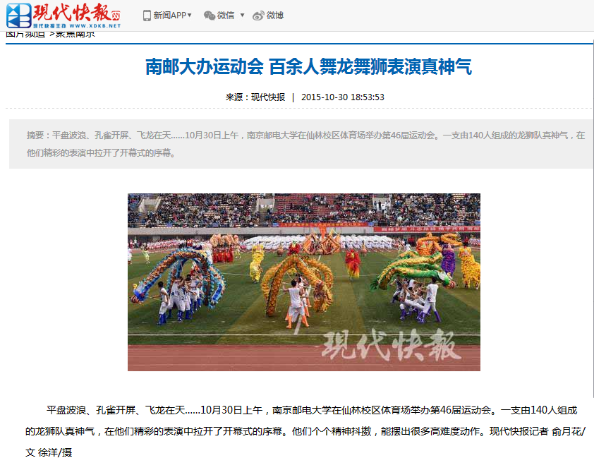 10月30日上午,南京邮电大学在仙林校区体育场举办第46届运动会。我院代表队方阵步伐整齐矫健、口号铿锵有力,舞龙舞狮气势如虹,充分展现了经院人的精、气、神!开幕式表演环节,大学生龙狮团带来了舞龙舞狮表演《水鼓,中国龙》,由140人组成他们精彩演绎了平盘波浪、孔雀开屏、飞龙在天等一系列高难度动作,祝愿学校运动会圆满成功,赢得了现场师生的阵阵掌声。现代快报进行了相关报道。