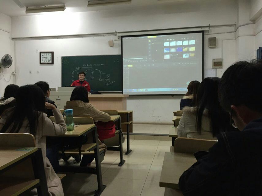 张荣恒学长对“会声会影”进行介绍。他首先概述了这款软件的功能和用途,然后初步演示了各个功能的操作和效果,从设置背景,选取素材以及控制视频播放等方面开始了基础的教学,为在场社员进行了讲解。现场气氛严肃认真,社员们认真观看学长的演示过程,也逐渐熟悉了关于软件的各项操作,掌握了处理图片、软件的基本技能。