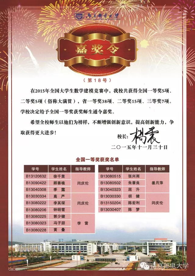 我院徐千里同学参与的队伍以江苏省初审A题第三名的成绩推至全国赛区,最终获得全国一等奖,学校给予通令嘉奖。在全国参赛的1326所高校中,我校获全国一等奖数量与(成都)电子科技大学等5所高校并列全国第一名,获得国家奖成绩与中国计量学院并列全国第二名,电子科技大学因获得本科组唯一“高教社杯”冠名奖摘得第一名。