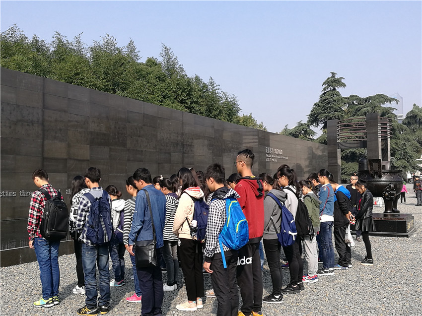 早晨8:30同学们在学校南门集合整装待发,一同前往侵华日军南京大屠杀遇难同胞纪念馆。来到南京大屠杀遇难同胞纪念馆门口,同学们的目光被《家破人亡》的高大雕塑所震撼,它反映了南京大屠杀的悲惨状况。6班同学首先举行了集体默哀一分钟。之后,同学们分为4个小组在展馆进行参观,踏过长长的石子路,大家怀着伤感与哀痛的心情,走进安静肃穆的纪念馆。昏暗的场馆内,照片、实物等历史真迹控诉着侵略者惨绝人寰的行径,生动再现的历史场景更是深深震撼着大家的爱国之心。刻满南京大屠杀遇难者名字的纪念墙,让同学们震惊;12秒的水滴声,让同学们心痛。近一个多小时的参观过程中,每个同学都屏息凝神,默默倾听过去的悲惨故事,表示自己对遇难同胞的缅怀与尊敬。场馆最后,“前事不忘,后事之师”八个洁白的大字提醒所有人,勿忘国耻,一定要珍视当下,维护和平。参观结束后,同学们在和平公园集合进行集体合照,一同返回学校。