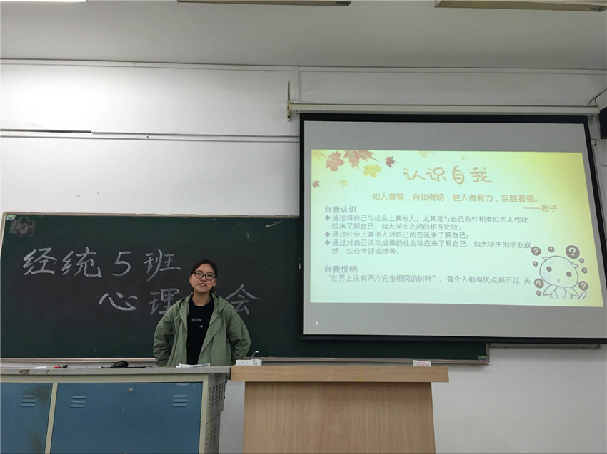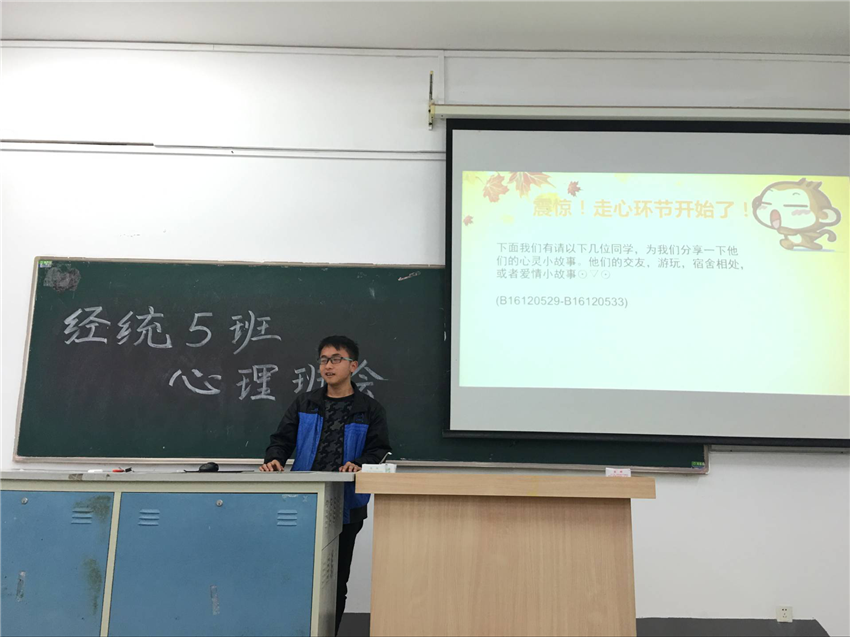 3月21日下午,经济学院经济统计学五班在教二105开展了一场心理班会,此次会议由心理委员王慧主持,出席此次班会有经济学院大一辅导员朱蔚懿老师和经济统计学五班的全体同学。