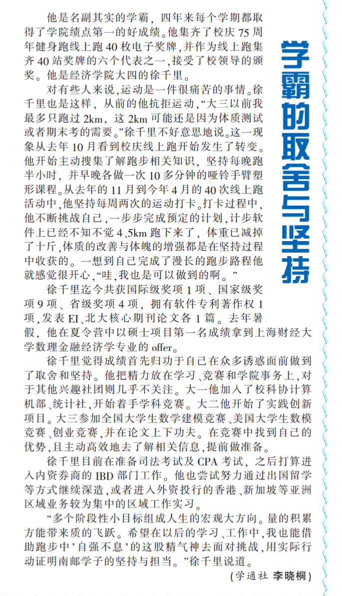 2017年5月1日,经济学院大四学生徐千里作为“薪火传·踏歌行”校庆健身跑的选手代表得到了南京邮电大学报第541期《热烈庆祝南京邮电大学办学75周年校庆专版》的特别报道。