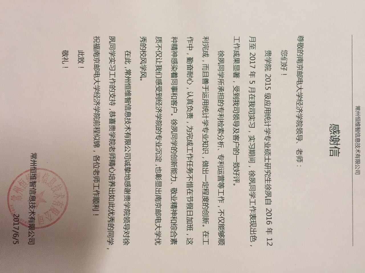 2017年6月5号,我院收到来自常州恒维智信息技术有限公司寄来的感谢信,表彰我院2015级应用统计学专业硕士研究生徐夙同学在2016年12月至2017年5月出色的实习表现。这份感谢信不仅是对我院学生工作的赞许和肯定,更是对全院师生继续努力,再创辉煌的鼓励。