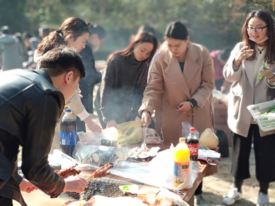 其次,班长在强调了安全问题后,分为两组来进行厨艺大比拼环节。在烧烤过程中,两组的师傅们都派本组的同学相互学习技艺。同学们分工合作、互帮互助,部分同学积极创新,为大家展示了难得一见的烹饪才能。