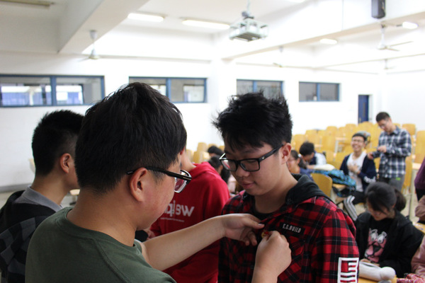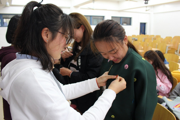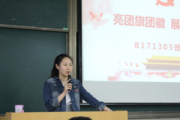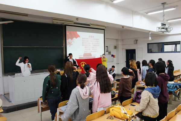 团支书盛丹丹带领同学们开展了以“亮团旗团徽,展团员风采”为主题的团日活动,组织团员在团旗前奏唱了《光荣啊!中国共青团》,重温入团仪式,为每一位共青团员佩戴了团徽,并在团旗前庄严宣誓。经无记名投票,在公平公正的原则下,推选出了韩丰和盛丹丹两名同学为入党积极分子。