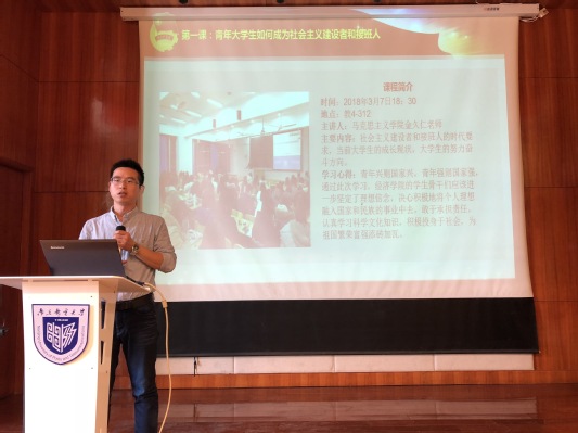 经济学院分团委书记王欢老师作课程回顾的报告。他回顾了九次菁英人才学校培训班理论学习的课程内容,肯定了菁英人才学校培训班对学员未来发展的助推作用,希望大家不负青春、砥砺前行。