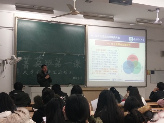 2019年3月1日晚,南京邮电大学第三十四期大学生菁英人才学校暨经济学院学生骨干培训班第一课在教3-205教室顺利举行。本次课程由马克思主义学院硕士研究生导师金久仁老师主讲,主题为《大学生职业生涯规划》。