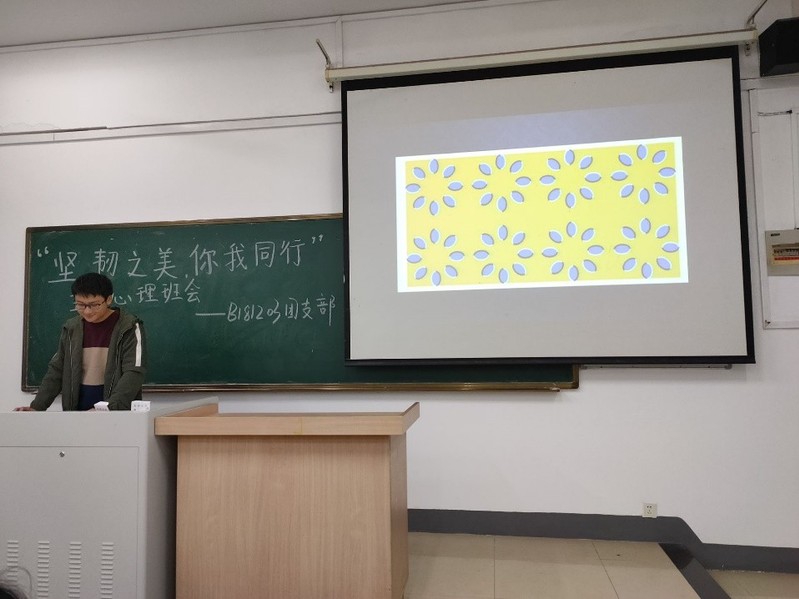 史伟同学首先向大家说明了大学生心理健康问题在社会中备受关注,然后利用多媒体普及了大学生心理健康标准,让同学们对心理健康有了一定程度的了解。之后向大家展示了一组关于心理测试的视错觉图片,激发同学们的兴趣。最后组织同学们完成一场互动,加深相互了解。