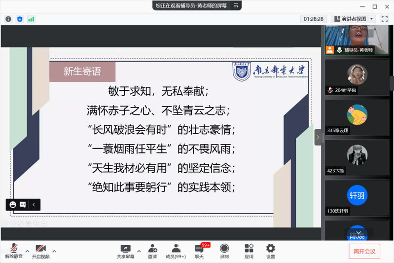 会议伊始,黄海生老师点明了此次线上年级大会的三大板块:关于辅导员、关于大学和关于自己。黄老师首先对辅导员这个职位进行了详细的解读并向同学们介绍了自己的履历,帮助大家更好地了解并走近辅导员。随后,黄老师为同学们大学四年的发展规划给予了合理的建议,并从消息接收与个人素养、学习与证书、宿舍与纪律、游戏与恋爱、金钱观、入党、社团等七个方向结合具体实例与同学们进行了交流与分享。最后,黄老师表达了对新生尽快适应大学生活的期望,希望同学们在疫情特殊背景下能够适应网络教学模式,主动进行自我提升。