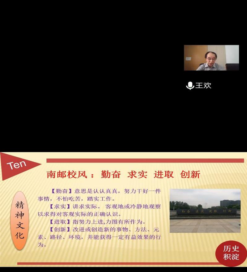 2021年9月8日上午,经济学院2021级举行理想信念教育。会议邀请到了校关工委颜福康老师,颜老师作为主讲人进行了以“继承光荣传统,凝聚南邮精神”为主题的校史校情讲座。会议由经济学院分团委书记王欢老师主持,2021级全体新生通过腾讯会议线上参会。
