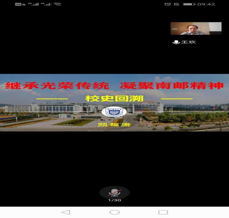 在讲座中,颜福康老师通过红色印记、革命传统、邮电情节以及育人风采等篇章讲述了南京邮电大学从1942年成立战邮干训班到成功入选国家双一流建设高校和江苏省高水平大学的七十九年校史。同时,颜老师着重提及了我校发展的见证人秦华礼老先生和他一生与南邮之间的种种传奇经历。最后,他又向同学们介绍了学校各方面的杰出校友以及我校在各式各类学科竞赛、学术成就方面取得的重大成功。