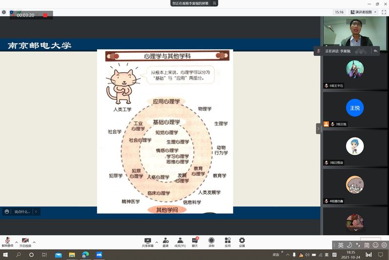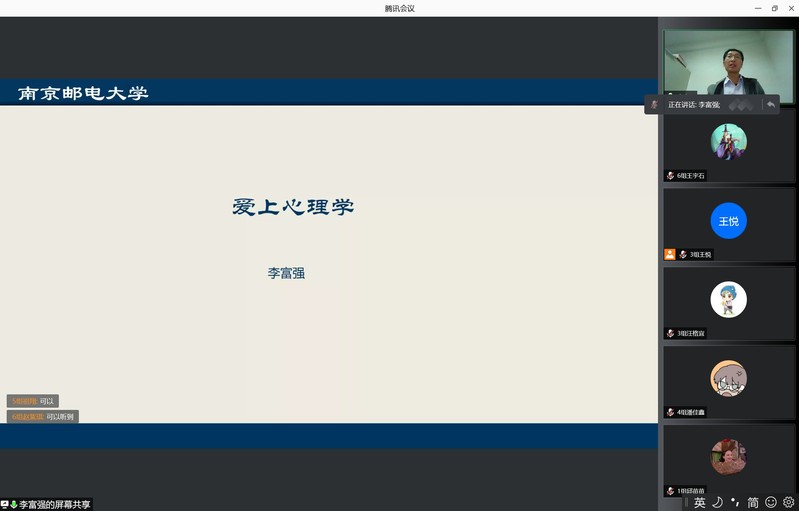 2021年10月24日晚,南京邮电大学第八十六期大学生菁英人才学校暨经济学院学生骨干培训班第十一课在线上顺利举行。此次课程的主讲人为我校教学质量监控与评估中心李富强老师,具体围绕《爱上心理学》这一主题展开授课。