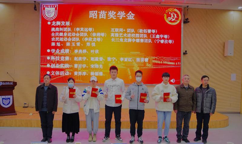 校关工委副主任储成祥、院关工委委员蒋华园、院党委书记黄宝凤为昭苗奖学金颁奖