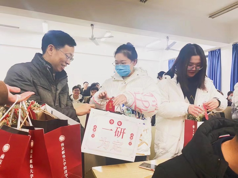 随后,老师们将学院精心准备的慰问礼包亲手发到每一位考研学子手中,传递了学院对于2018级考研学子的祝福与期待。慰问礼包中除了包含补充体力的食物饮品、寓意平安顺遂的苹果、象征祝福的满天星花束,更放有一张来自辅导员王珏亲手书写的祝福卡片。一字一句,表达了辅导员弄弄地关爱与祝福。正如卡片上所写:“星光不负赶路人,付出终将有回报!”愿大家放平心态,稳定发挥,考出期待的好成绩,无愧于自己的付出与努力!