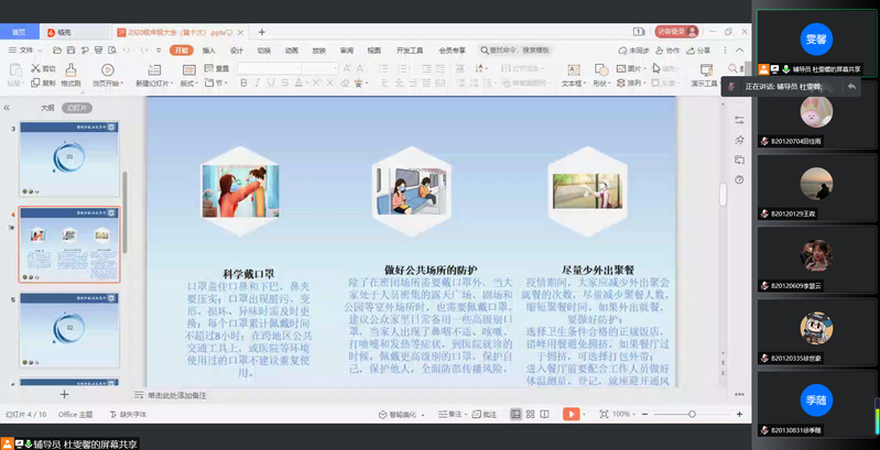 为从严从紧落实学校疫情防控措施,提高学生自觉遵守疫情防控有关规定的意识,2022年1月20日下午16:00,经济学院2020级在线上召开了疫情防控工作动员会,2020级全体同学参加。会议由2020级辅导员杜雯馨老师主持。