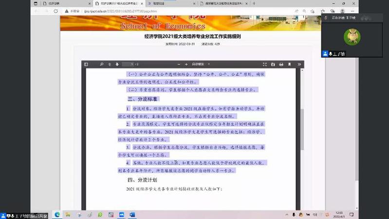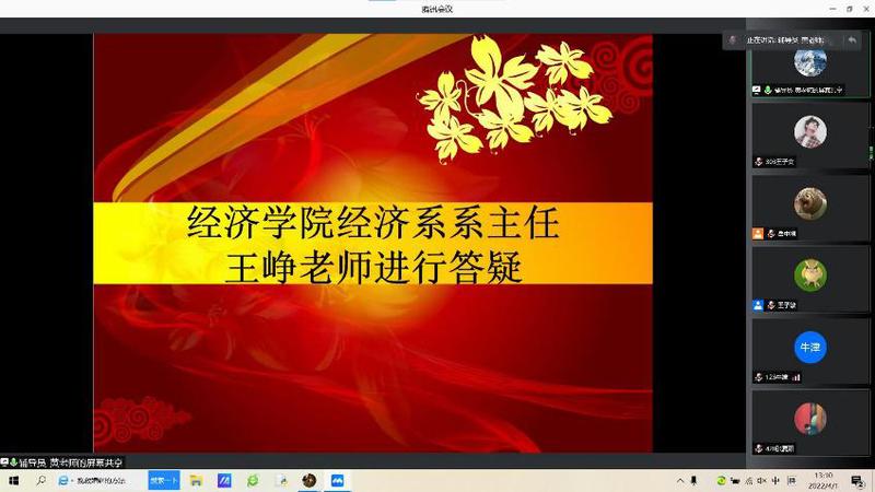 2022年4月1日中午,经济学院2021级经济学类专业分流情况沟通会通过网络平台顺利举行。经济学院院长岳中刚教授、党委副书记兼副院长董军老师、副院长王子敏老师、经济系系主任王峥老师、经济统计系系主任易莹莹老师出席。2021级经济学类全体本科生线上参会,会议由辅导员黄海生老师主持。
