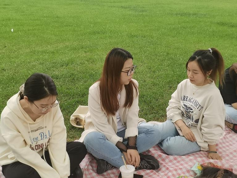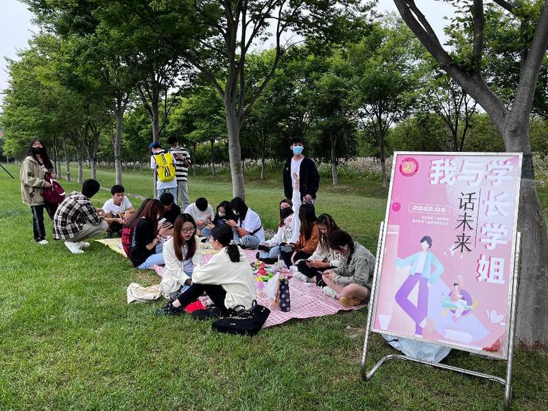 本次交流会以户外座谈、经验分享、自由提问的方式进行,按照读研深造和求职就业分设2类交流席位,邀请了学院2022届考研至武汉理工大学的白纪新、考研至东华大学的王佳雪以及即将分别在招商银行、新奥新智科技公司就职的任艳霞、王燕给低年级同学做经验分享。