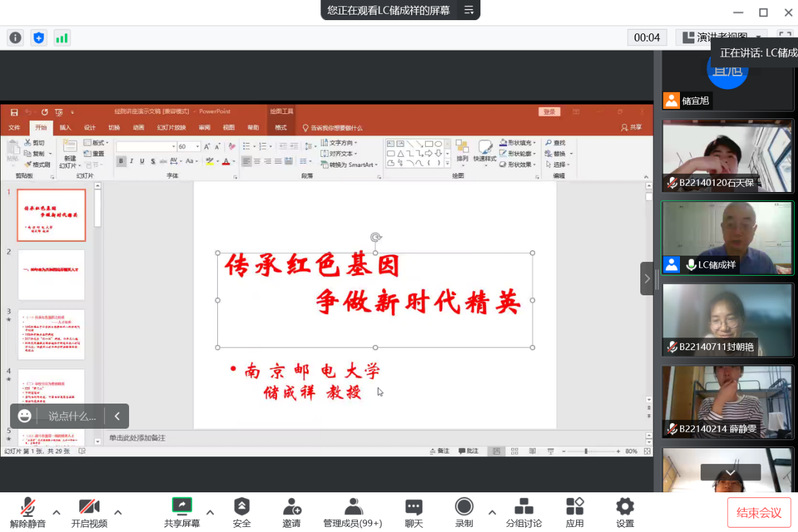 2022年9月14日上午,经济学院举行2022级新生爱国主义教育。会议邀请到了校关工委副主任储成祥教授,并以“传承红色基因,争做新时代精英”为主题进行了专题讲座。会议由经济学院辅导员储宜旭老师主持,2022级全体新生在线上进行了学习。