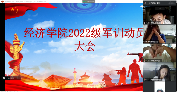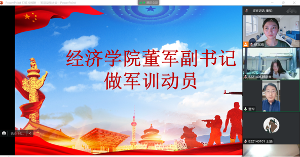 2022年9月19日晚,经济学院的同学线上集中召开军训动员大会。院党委副书记、副院长董军、军训教官闫光华出席会议,辅导员储宜旭主持会议。