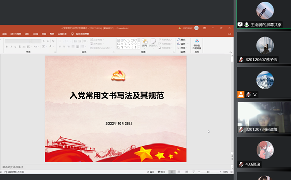 2022年10月26日中午,南京邮电大学第一百一十七期大学生菁英人才学校暨经济学院骨干培训班第十二次课于线上顺利举行。本次课程的主讲人为王珏老师,具体围绕《入党常用文书写法及其规范》这一主题展开授课。