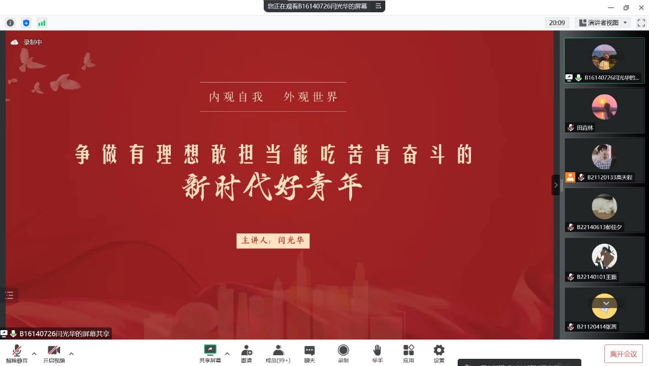 在本次公开课中,闫光华同学深情讲述了原南京邮电学院党委书记兼院长秦华礼先生“此生惟愿心向党”的红色故事,学习弘扬秦老一生跟党走的崇高理想信念。“功崇惟志,业广惟勤”,我辈青年应树立远大理想,将“小我”融入民族、国家乃至全人类的“大我”之中,以青春理想引领人生航向,坚定不移地高举中国特色社会主义旗帜。随后,闫光华同学以中印加勒万河谷戍边英雄们“大好河山、寸土不让”的光辉事迹为例,并结合一众历史伟人的人生箴言及生平经历展开分享,进一步勉励学员们要强化自我责任担当、甘于吃苦奉献、敢于拼搏奋斗,立志做有理想、敢担当、能吃苦、肯奋斗的新时代好青年。
