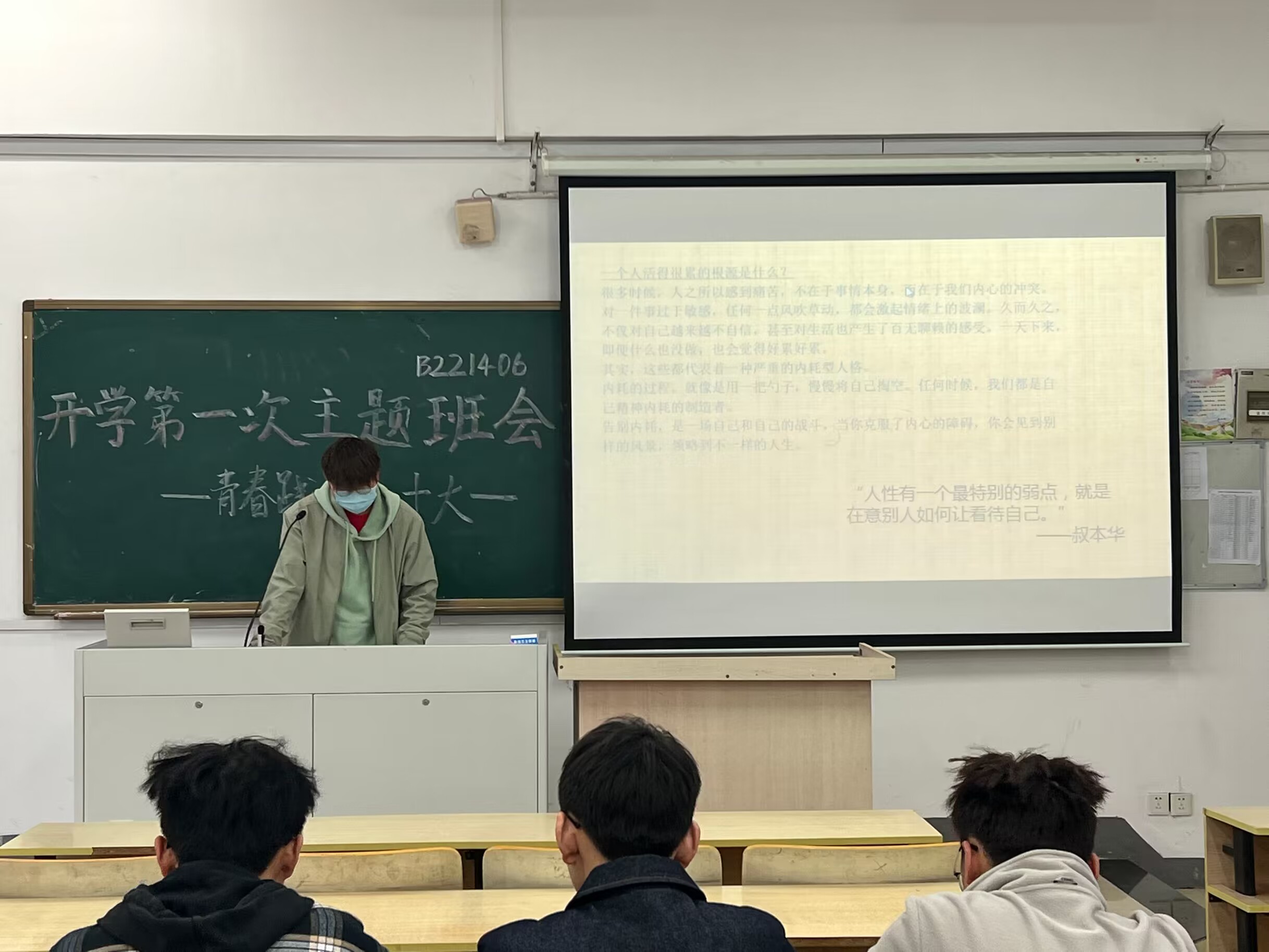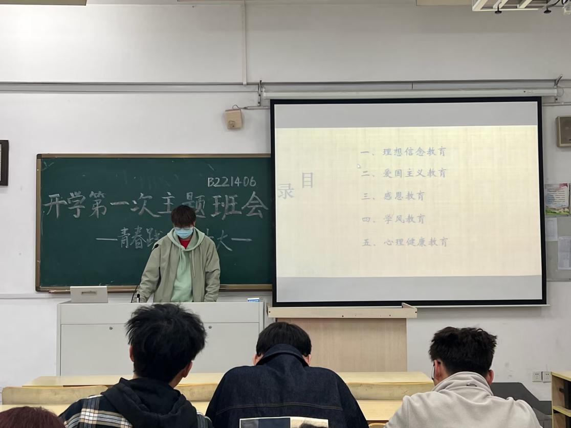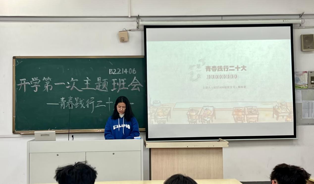 2023年3月23日上午,随着第二学期的开始,经济学院B221406班举行了新学期的第一次班会“青春践行二十大,百尺竿头谱华章”。此次班会由三个部分构成,分别由B221406班团支书陶雨萱、班长胡乐圣和组织委员李贵铃展开主题宣讲,班会由班长胡乐圣同学主持,B221406班全体同学参加。