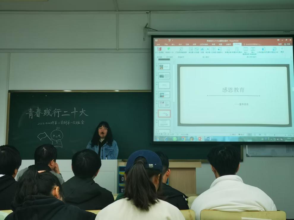 为深入学习全面贯彻党的二十大和二十届历次全会精神,经济学院B221405班级于3月22日在教2-104开展了以“青春践行二十大”为主题的班会活动。本次班会由班长吴佳芮同学主持,班主任宋灿老师应邀出席班会。