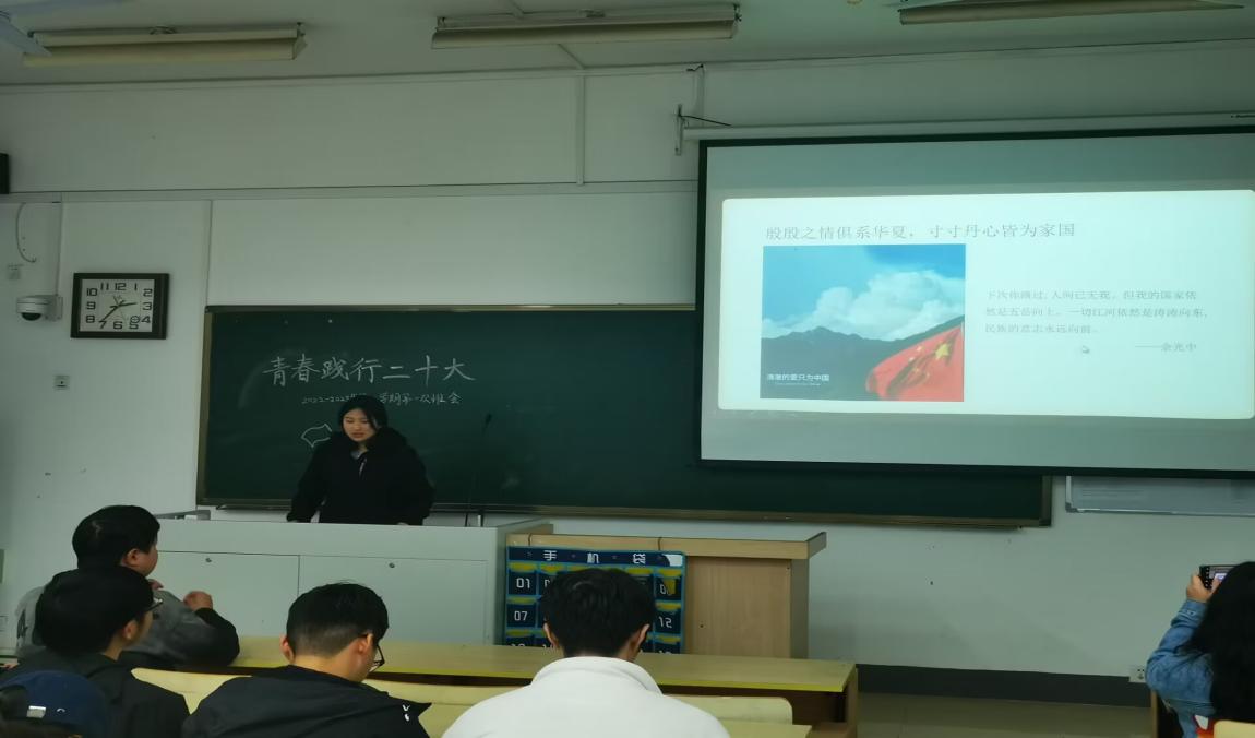 在本次活动中,班长围绕五个关键词——理想信念、爱国主义、感恩教育、学风教育、爱校荣校分享了践行党的二十大精神、立志成长为新时代好青年的思考和实践。身处于大学的我们,处于最好的年纪与时代,我们理应将小我”成长融入“大我”奋斗之中,奉献于祖国,激励同学们的家国情怀,涵养进取品格。拥护党的领导和党中央决策部署,坚定不移跟党走,进一步激发青年学习热情,积极培育和践行社会主义核心价值观。