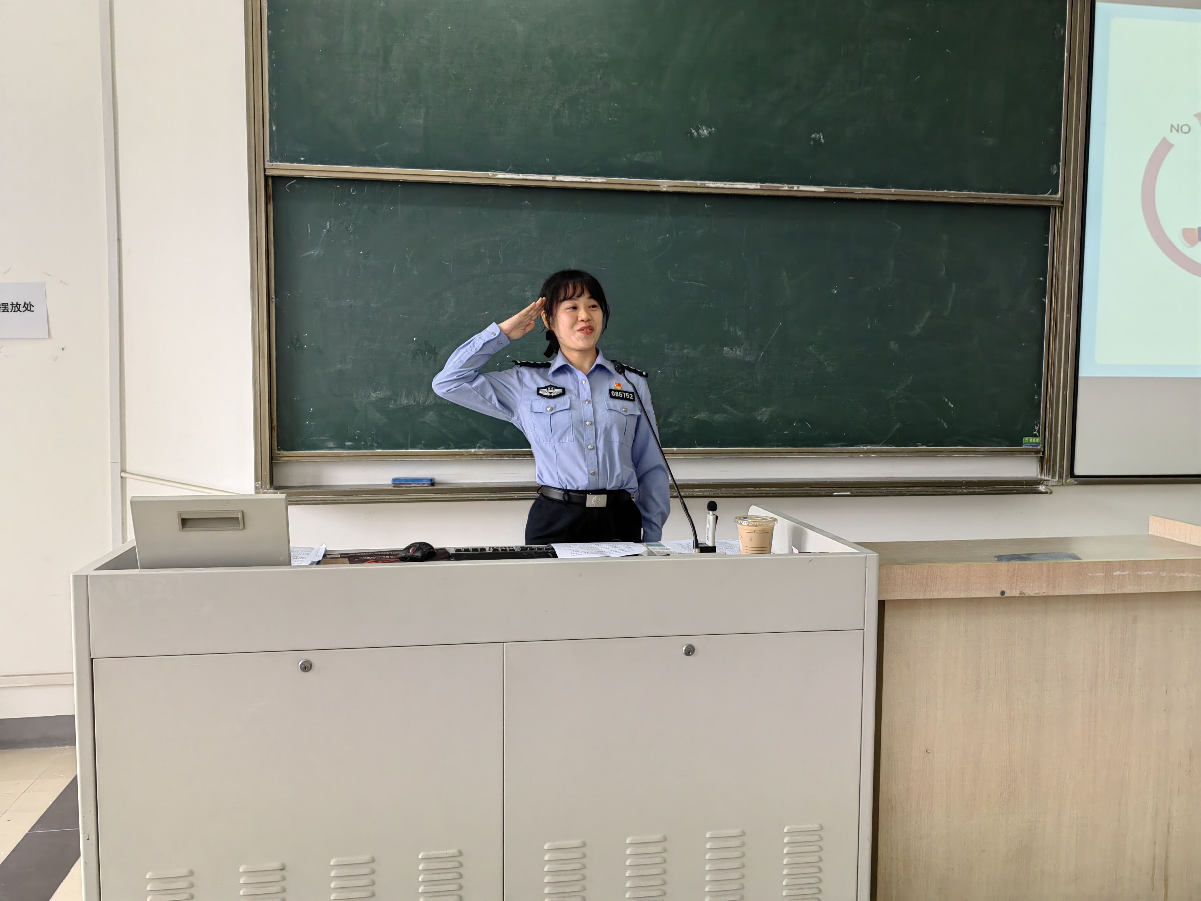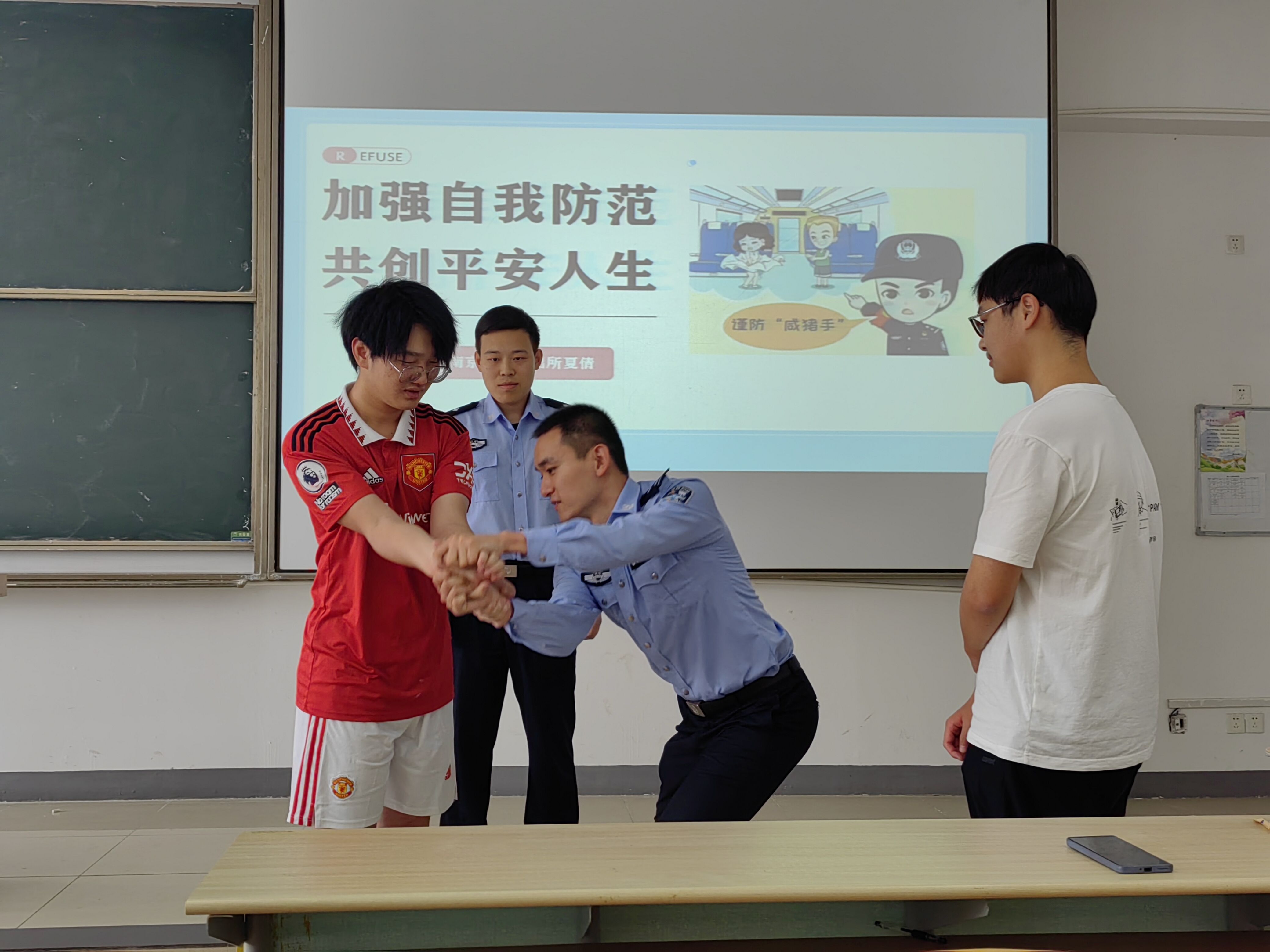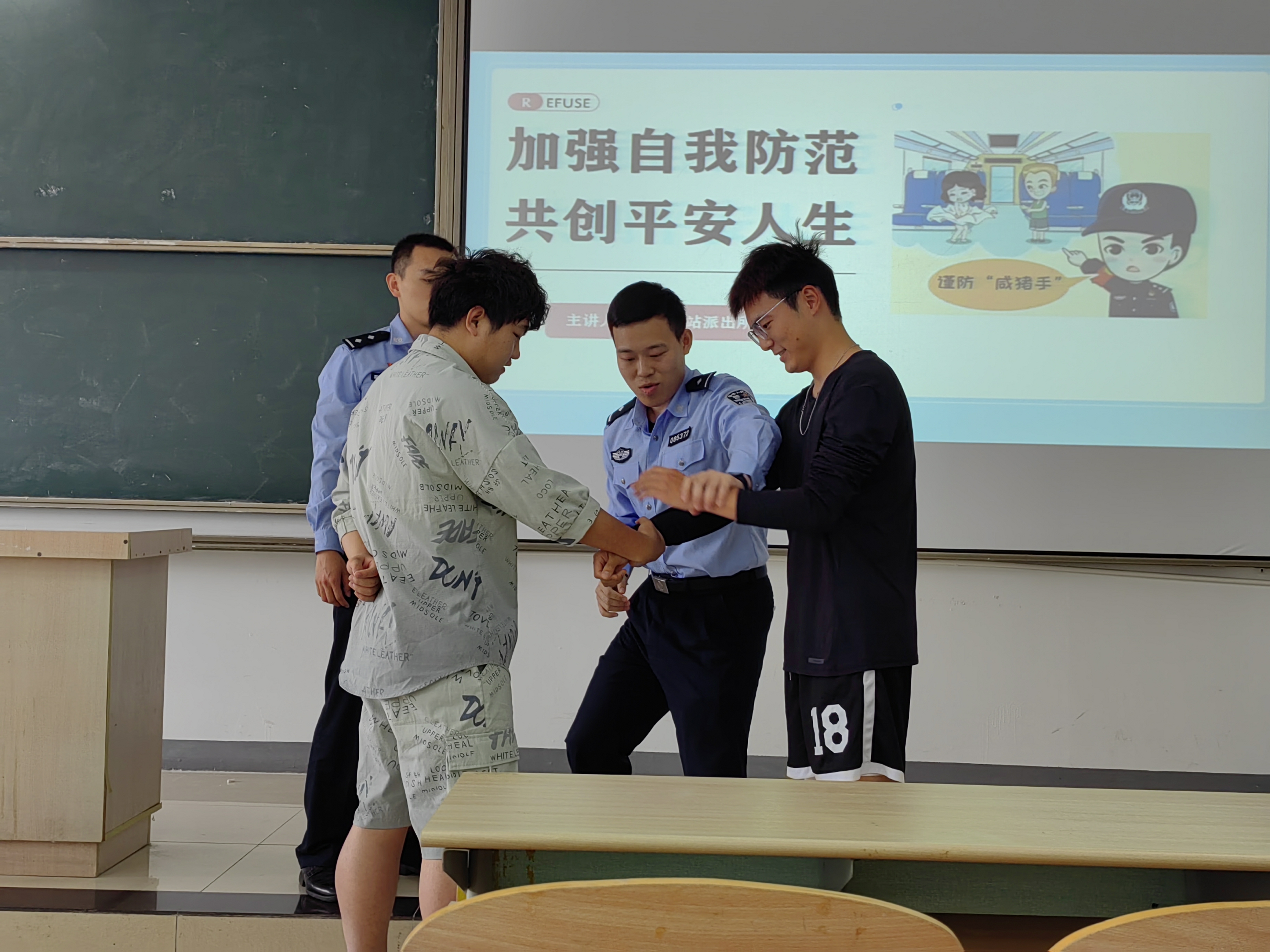 课程伊始,夏倩警长以近年来车站列车猥亵案件频发的问题为引,向同学们介绍了猥亵的定义,并提出猥亵案件具有社会影响大、取证困难、然而违法情节一般不严重的特点,由此说明了有效打击猥亵违法行为依旧任重道远的现状。随后,夏倩警长结合实际案例向同学们介绍了遇到猥亵事件时的正确做法,如影像取证、及时寻求警方和工作人员的帮助等具体方法,号召同学们要提升自我防范意识,勇敢打击不法行为。课程最后,为帮助同学们真正学习到保护自己的本领,两位派出所警官现场向大家传授防猥亵的动作要领,并邀请了四位同学上台学习展示,进一步加深同学们对防范动作的记忆。
