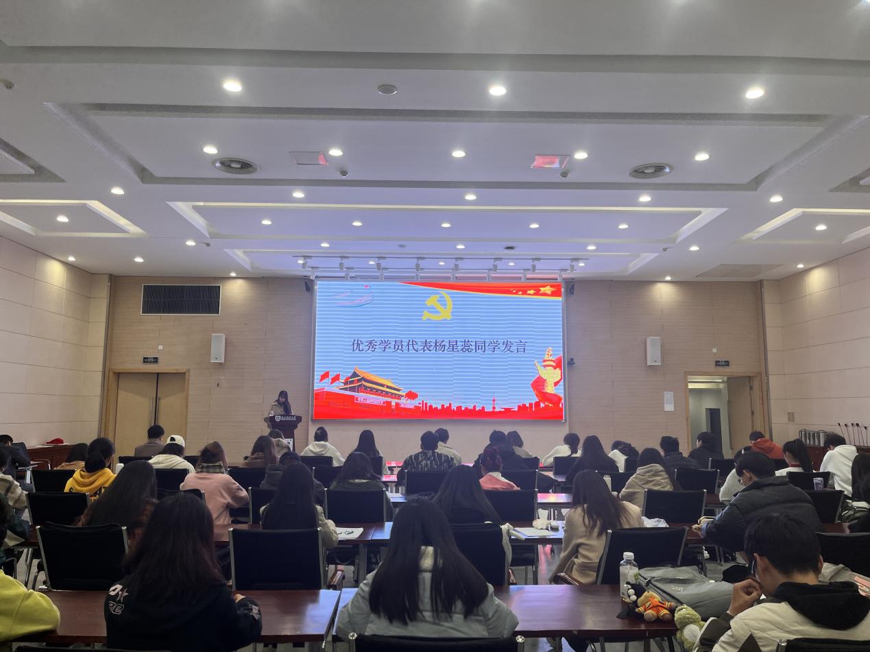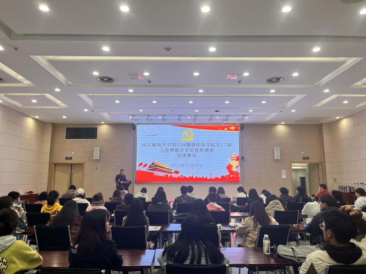 2023年11月22日中午,南京邮电大学第518期暨经济学院第17期入党积极分子党校培训班结业典礼在计算机学科楼中兴报告厅举行。经济学院党委书记董军老师出席并讲话,培训班顺利结业的55名学员参加。结业典礼由学院组织员黄海生老师主持。