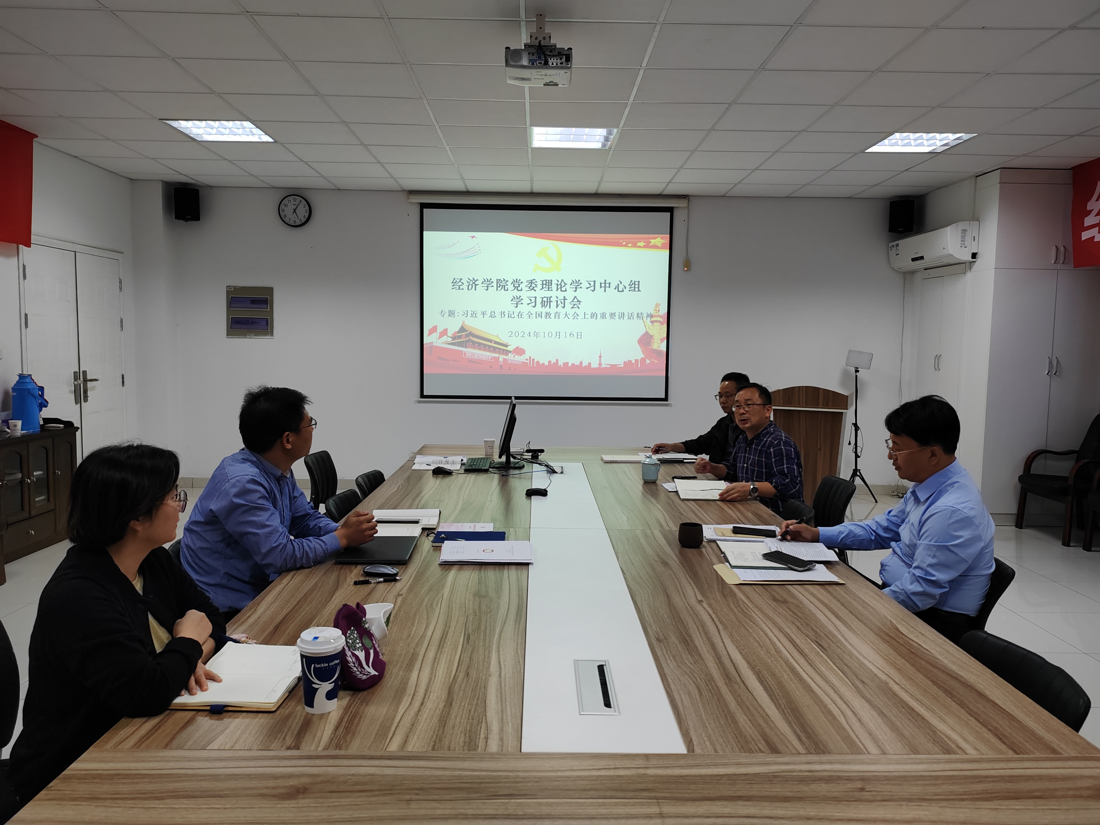 2024年10月16日下午,经济学院党委理论学习中心组在文科楼529会议室专题学习习近平总书记在全国教育大会上的重要讲话精神。会议由经济学院党委书记、党委理论学习中心组组长董军同志主持,部分中心组成员作重点交流发言。