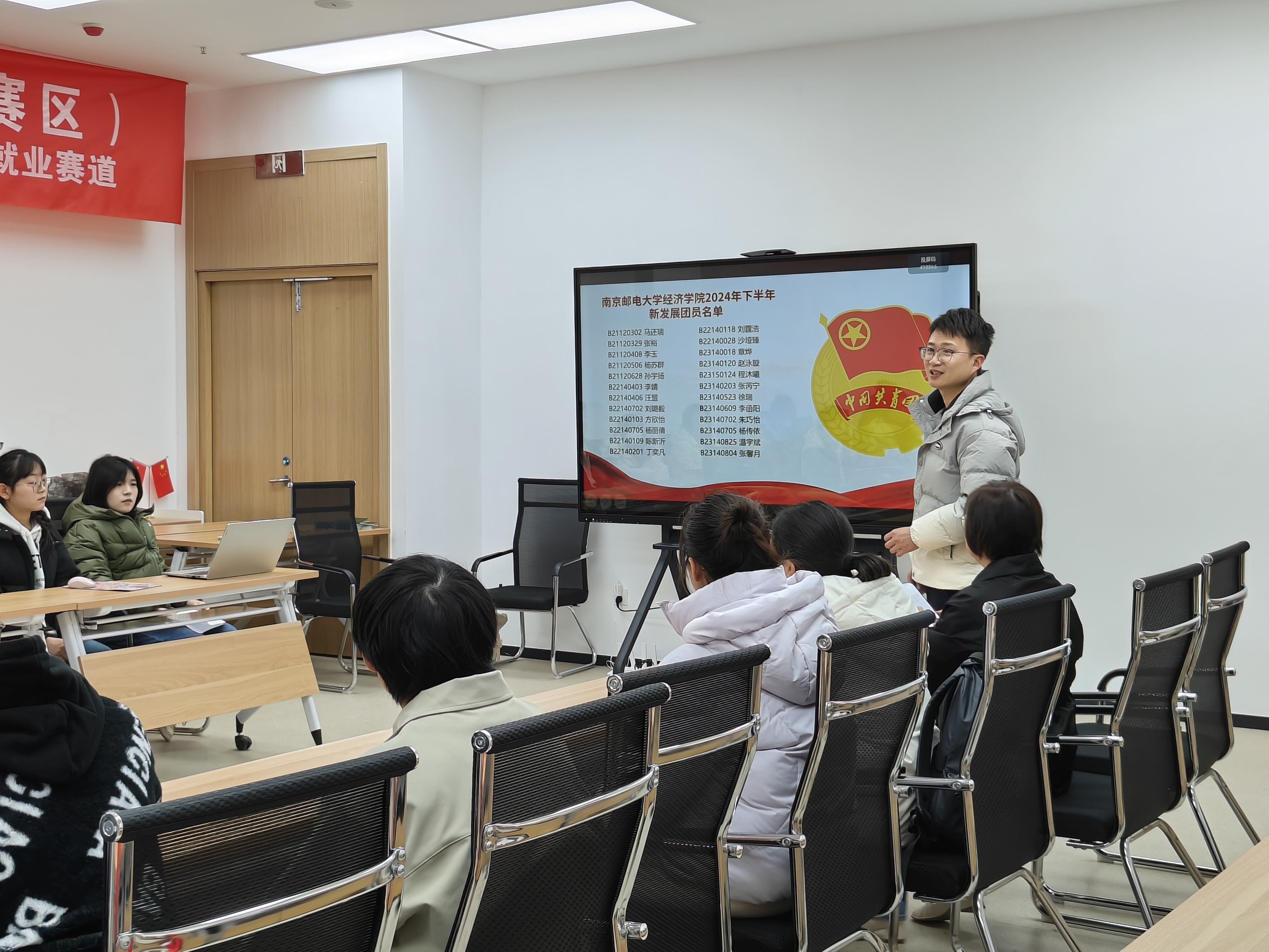 青春心向党,青年勇担当。为全面学习贯彻落实党的二十大精神,进一步继承和发扬共青团优良传统,增强团组织的凝聚力,提升青年团员的政治素养,12月13日中午,南京邮电大学经济学院举行新发展团员入团仪式。本次仪式由22级本科生刘莹莹同学主持,经济学院党委副书记兼副院长吴迪、经济学院分团委书记兼2023级辅导员尤波及新发展团员参会。