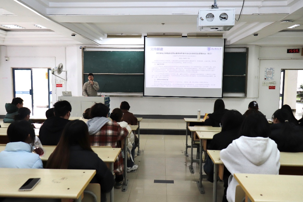 春风拂面,新学期的序章已然开启。为总结上学期工作、表彰优秀典型、合理学期规划、增强安全意识,经济学院于3月17日在教2-101召开2023级期初年级大会。本次大会由辅导员尤波老师主持,经济学院党委副书记、副院长吴迪出席,2023级全体学生参会。