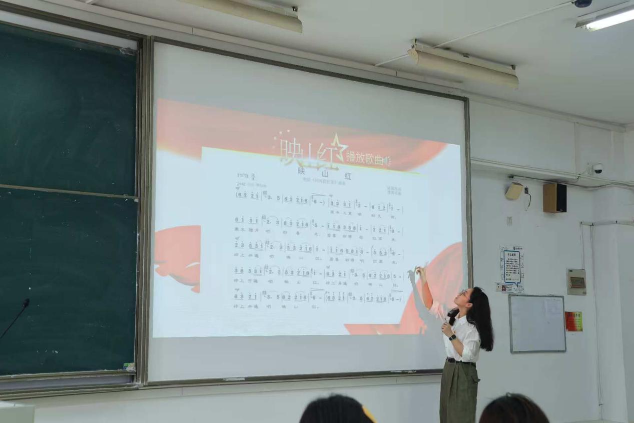 红色经典是历史的见证,是精神的传承,更是激励新时代青年奋勇前行的力量源泉。课程尾声,传媒与艺术学院2023级本科生专职辅导员陶乐行老师以一段《映山红》的清唱,引出红色音乐的内涵与当代价值,从文化传承的角度深化了课程主题。她还通过《东方红》《歌唱祖国》等经典作品的解读,深入剖析了红色文化的精神内涵,巧妙衔接了前两位主讲人关于“时代精神”的论述。在互动环节中,她引导同学们思考如何从红色音乐中汲取精神力量,将红色基因转化为新时代的实践动能,为整场课程画上了圆满的句号。