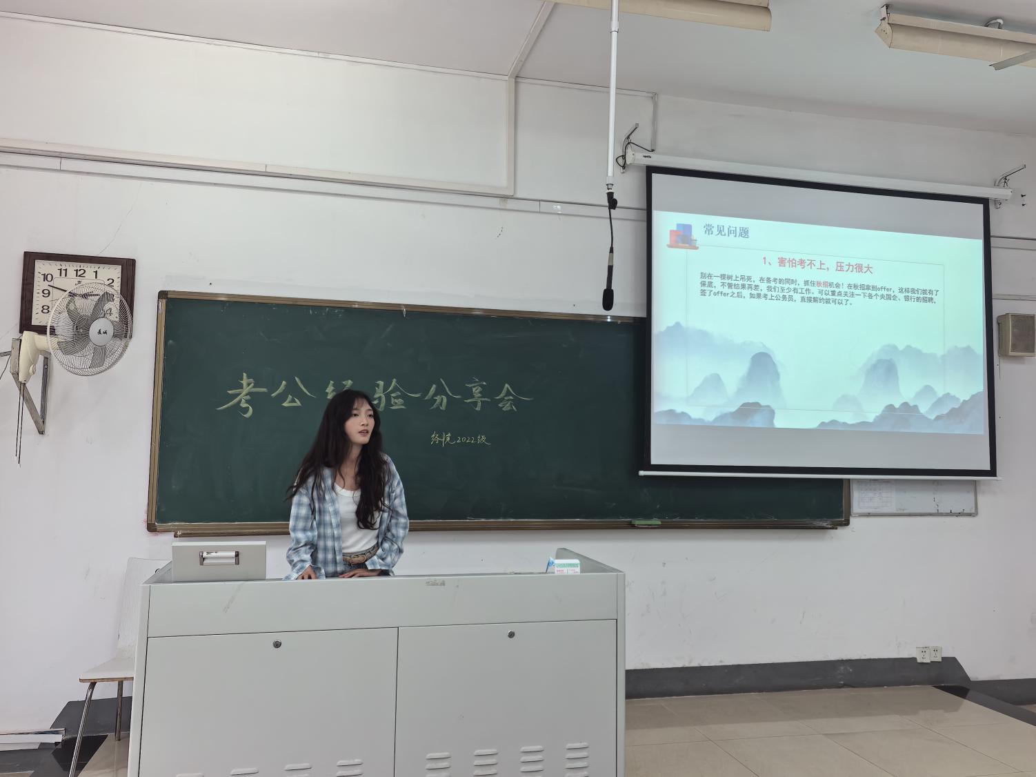 为助力2022级学生了解公务员考试、明确备考方向,学院于612日下午在教4-105教室举办考公经验分享会,特邀2025届成功考取公务员的周欣悦、谭心钥两位同学担任主讲。