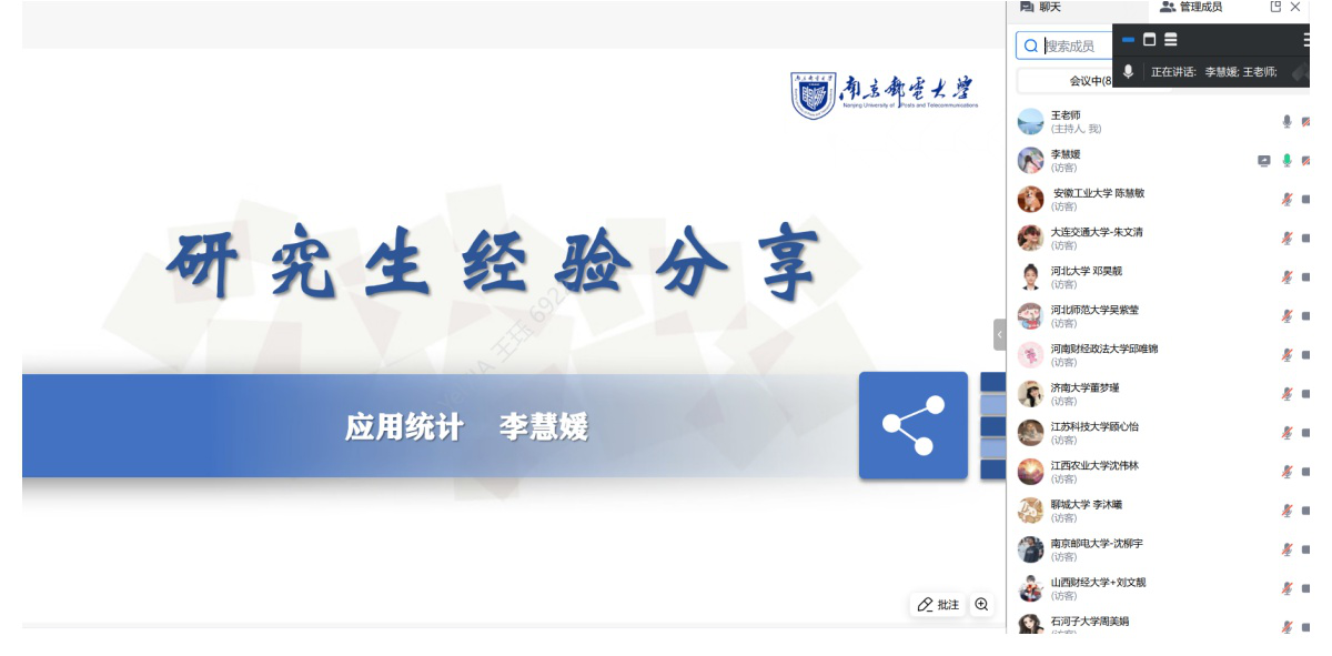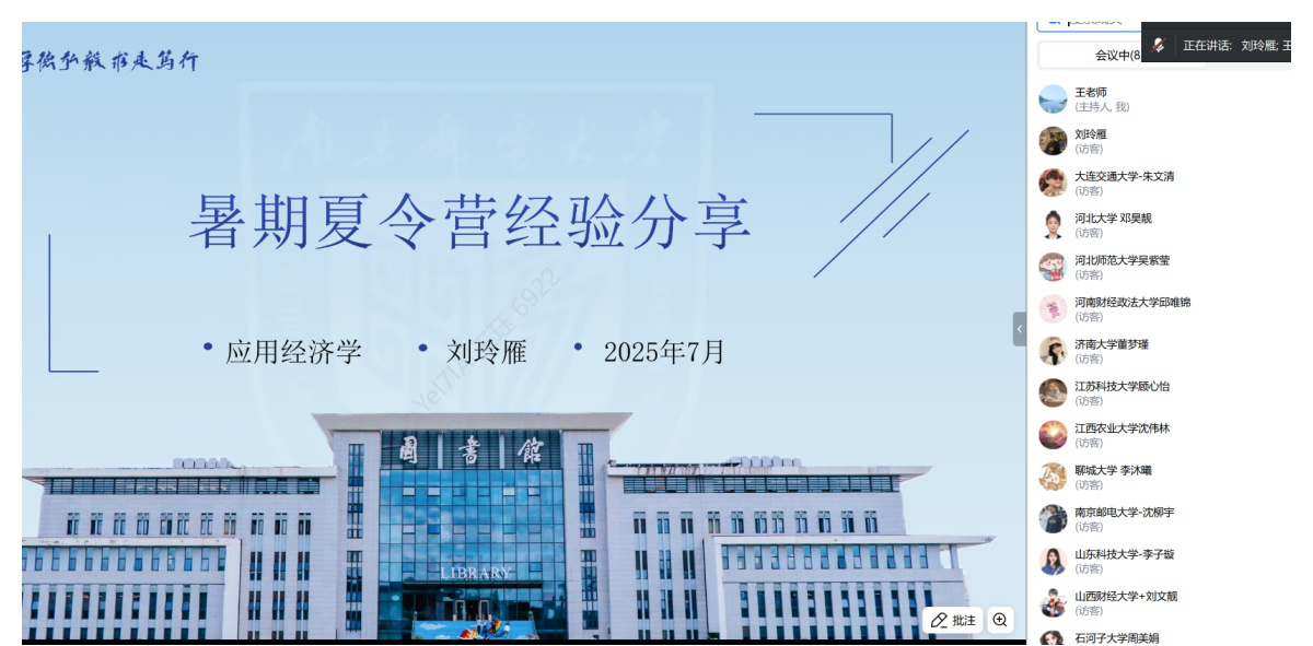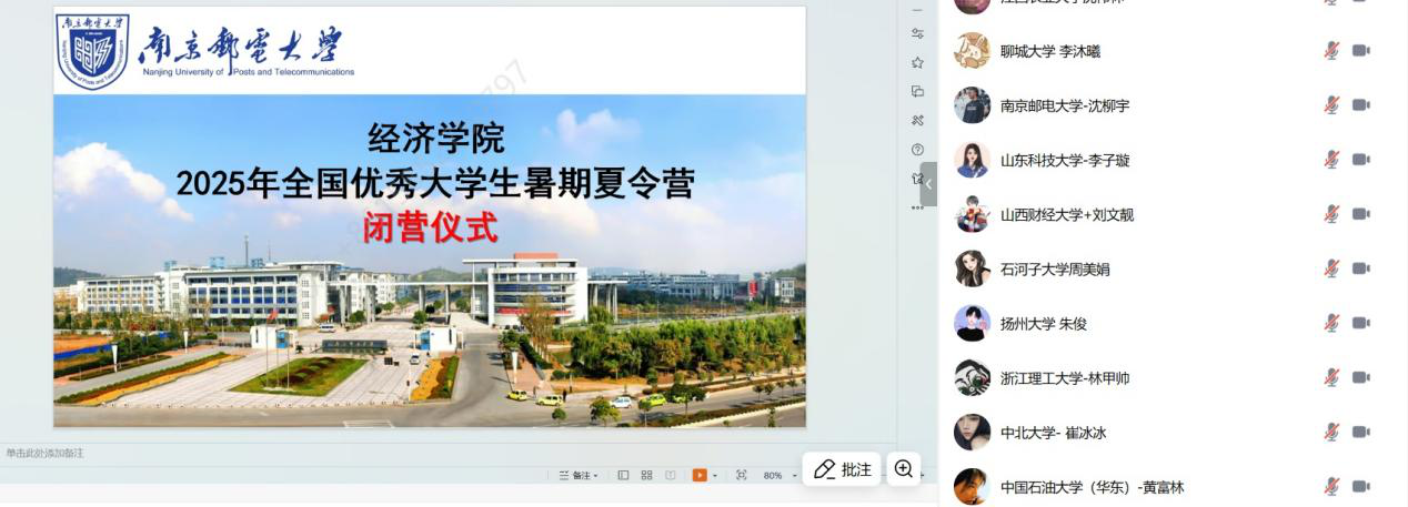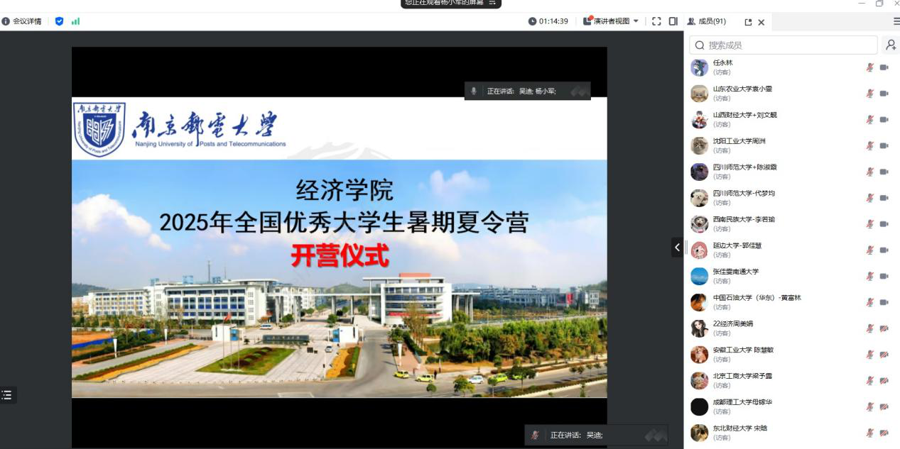 为增进国内高校优秀本科生对南京邮电大学经济学院研究生培养情况的了解,吸引有浓厚科研兴趣和发展潜力的优秀大学生进入南京邮电大学经济学院攻读硕士研究生,2025年7月14日,经济学院顺利举办了“2025全国优秀大学生暑期夏令营”。本次夏令营采用线上形式,通过个人材料递交、学院审核选拔,招收正式营员、旁听营员共计190位同学。