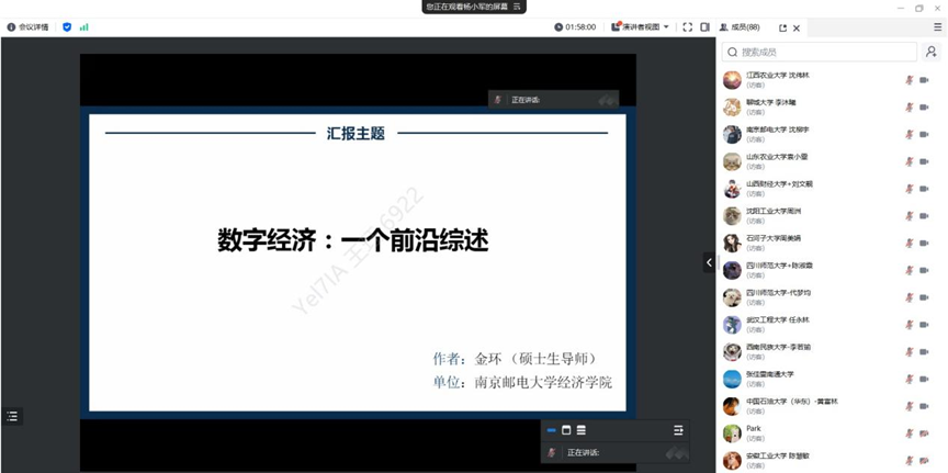 开营仪式结束后,经济学院金环老师为营员们带来了题为《数字经济:一个前沿综述》的专题讲座。金老师从数字经济的演进、数字经济的相关研究、数字经济的分支研究三方面,为营员们在数字经济领域可挖掘的研究方向上带来启发。讲座结束后,营员们围绕讲座主题进行了深入的交流与研讨,通过与金老师互动,营员们对数字经济相关领域的问题有了更为透彻的理解。
