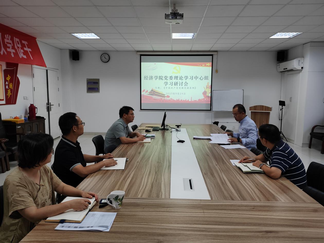 2025年9月24日下午,经济学院党委理论学习中心组在文科楼529会议室专题学习《中国共产党党徽党旗条例》(以下简称《条例》)。会议由经济学院党委书记、党委理论学习中心组组长刘挺同志主持,中心组成员作交流研讨。