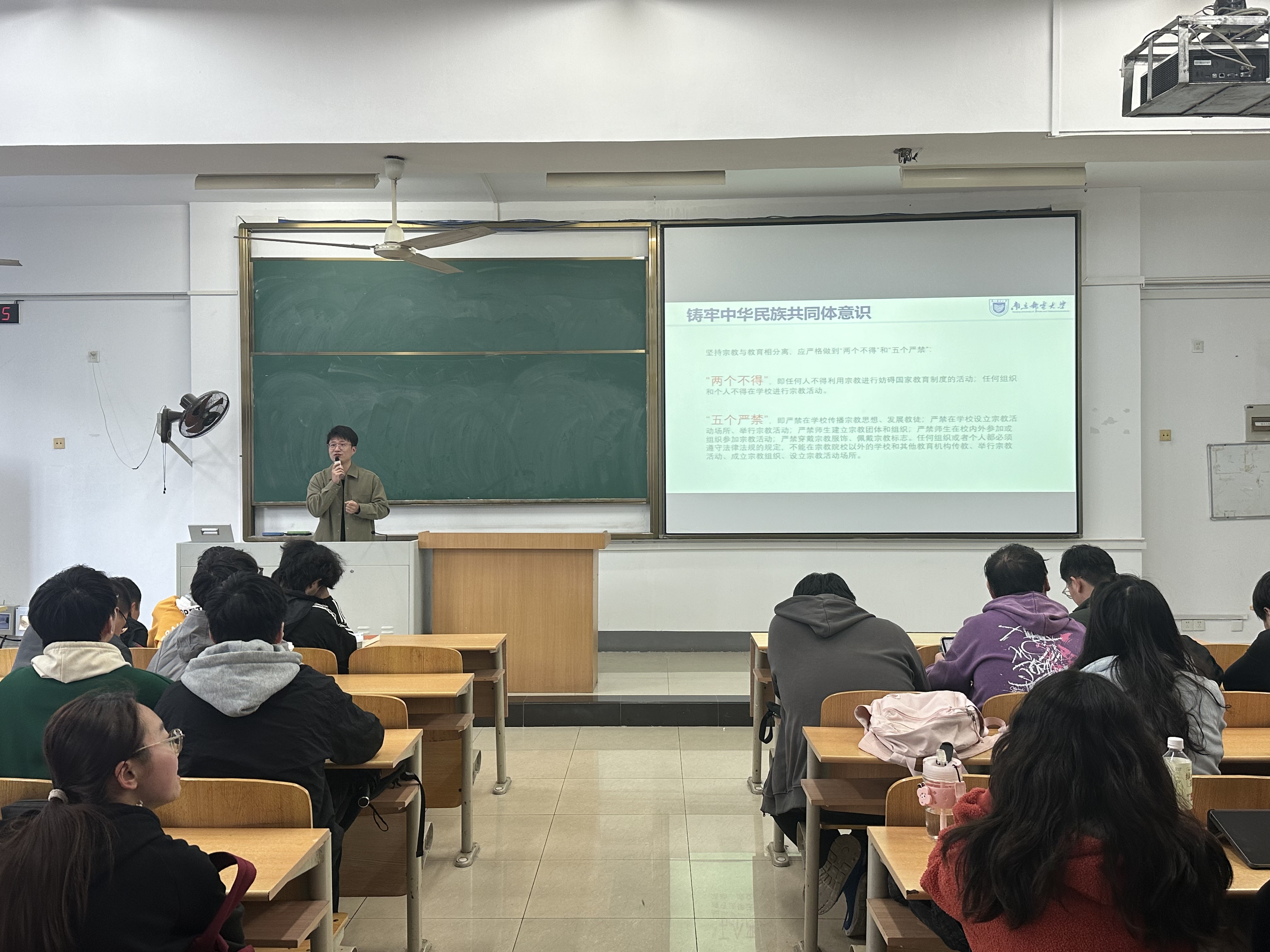 首先,尤波老师结合近期出现的以免费或低价旅游为名、实际组织学生参与非法活动的案例,强调要坚持宗教与教育相分离的原则,提醒年级同学严格做到“两个不得”和“五个严禁”,切实铸牢中华民族共同体意识。对请假制度、宿舍管理要求等进行了再次说明,借用近期发生的电信诈骗典型案例,提醒全体学生务必增强防范意识,不轻信网络兼职、低价购物、网友见面等诱惑,避免财产损失与人身安全隐患。最后,年级大会上还传达了相关学科竞赛的通知,鼓励学生积极备赛、尽早规划,通过参与实践或竞赛等方式积累相关学分,提高自我核心竞争力。