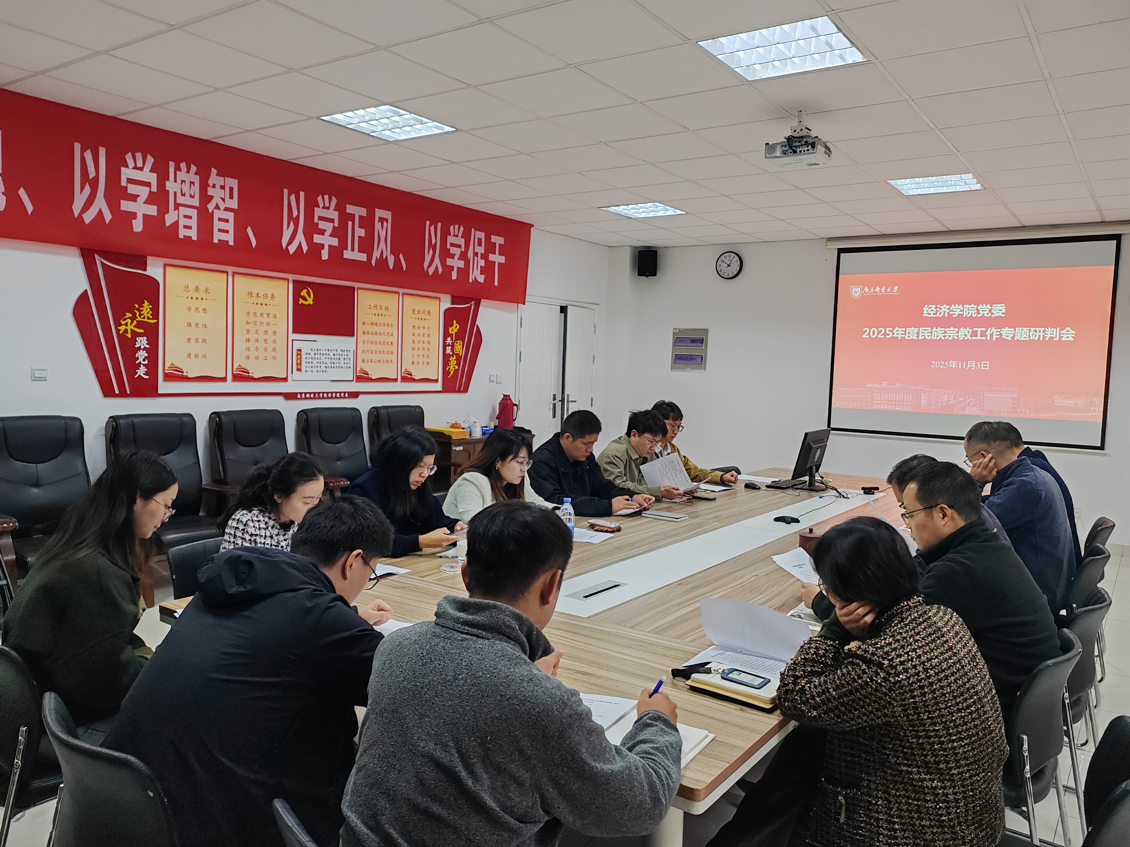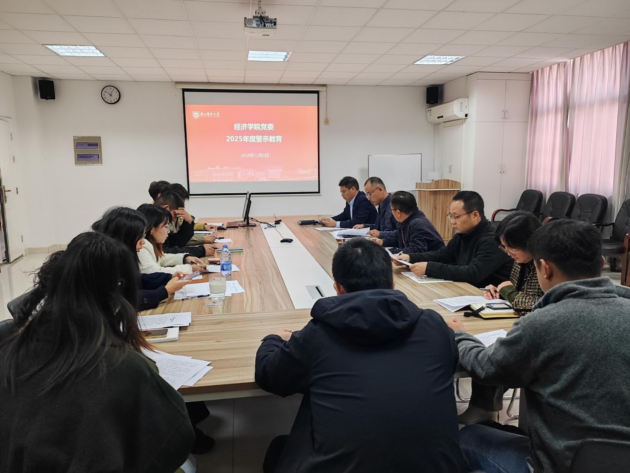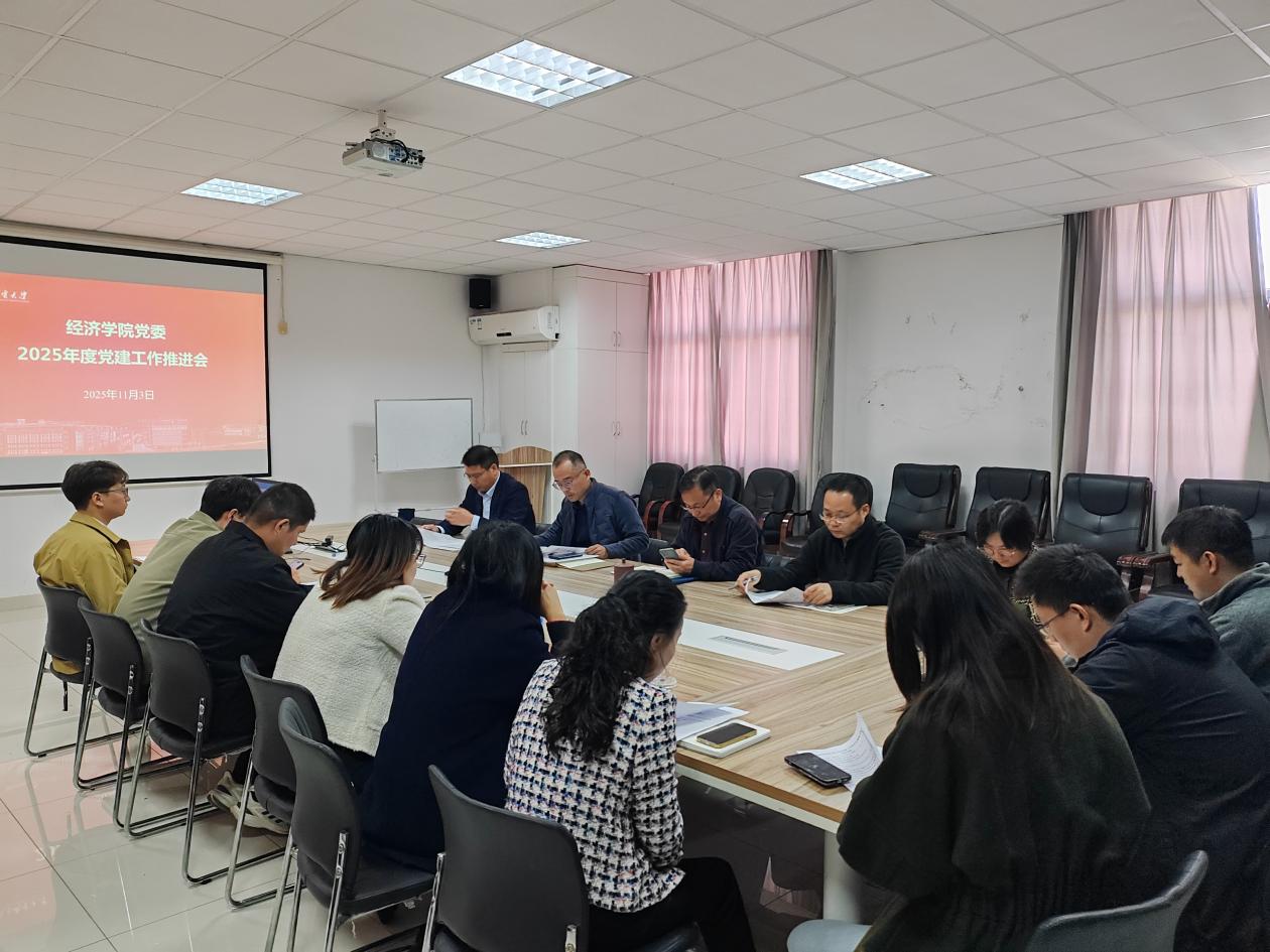为深入学习贯彻党的二十大和二十届二中、三中、四中全会精神,持续推进党建目标任务落地落实,为学院高质量发展提供坚强组织保障,2025年11月3日上午,经济学院党委在文科楼529会议室召开2025年度党建工作推进会。会议由学院党委书记刘挺主持,学院党委委员、各党支部支部书记参加。