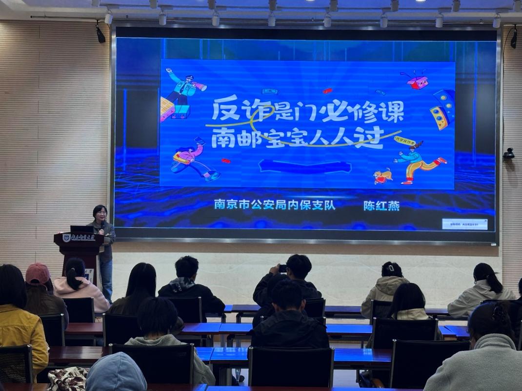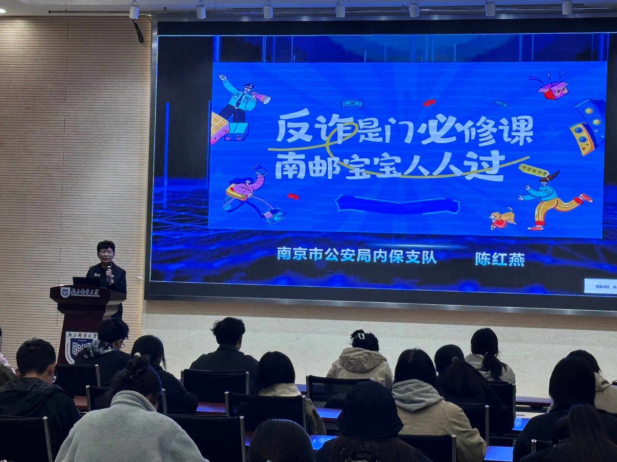 为全面提升学生防范电信网络诈骗的意识和能力,筑牢校园安全防线,2025年10月21日下午,经济学院在中兴报告厅举办“反诈是门必修课,南邮宝宝人人过”主题讲座。本次活动特邀南京市公安局内保支队反诈专家、金牌讲师陈红燕警官担任主讲,学院党委副书记、副院长吴迪出席,经济学院2025级全体研究生、本科学生骨干参会。